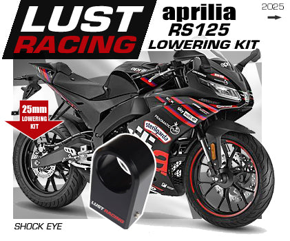 Aprilia RS125 2025-2026 lowering kit 25mm / 1"inch by LUST Racing. Replaces the upper shock eye on the rear shock absorber and reduces the seat height by approximately 25mm. Manufactured out of billet aerospace 6061-T651 aluminum. Anodized black, with LUST Racing logo in chrome and red. Manufactured in Great Britain.